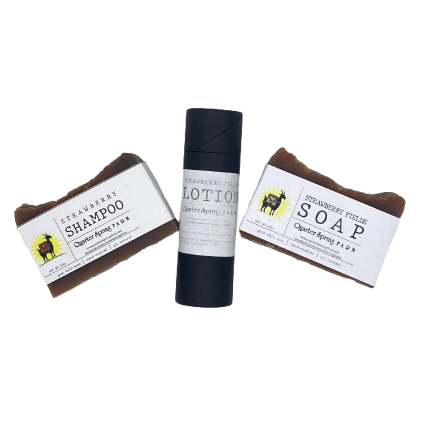 This gift set contains our delicious smelling strawberries and cream scented soap, shampoo, and lotion.