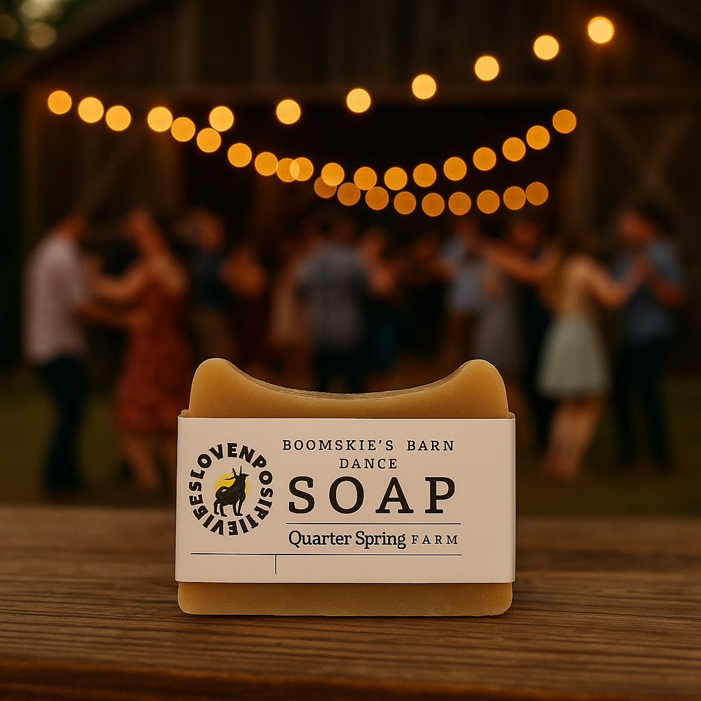 This Boomskie's Barn Dance soap is part of our Love n Positive Vibes collaboration. With its cedarwood and fir scent, this soap will have you dancing in your barn (or shower). Enjoy the goodness of goat milk and the uplifting aroma of this soap. It's sure to bring a smile to your face and a little pep in your step. Get ready to rock the barn with Boomskie's Barn Dance soap